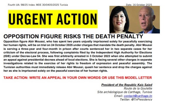 أصدرت منظمة العفو الدولية اليوم بيانًا دعت فيه رئيس الجمهورية التونسية قيس سعيّد إلى التدخل العاجل من أجل الإفراج الفوري عن رئيسة الحزب الدستوري الحر عبير موسي، معتبرة أن استمرار سجنها منذ عامين يمثل “انتهاكًا صارخًا لحقوق الإنسان ولحرية التعبير”.