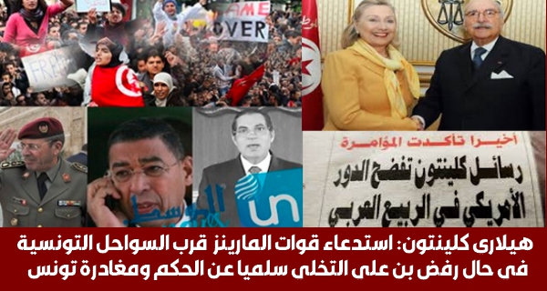 ماذا عن حديث هيلاري كلينتون في مذكراتها عن ليلة هروب بن علي؟ ما صارتش ثورة في تونس امريكا أجبرت بن علي على التخلي عن الحكم .. امريكا قررت عبر سفارتها في تونس غلق المجال الجوي التونسي يوم 14 جانفي 2011 واستدعاء قوات المارينز المتمركزة في قاعدتنا بصقلية قرب السواحل التونسية وذلك في حال رفض بن علي التخلي عن الحكم سلميا ومغادرة تونس